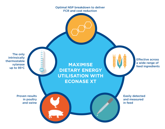 Econase XT is the only intrinsically thermostable xylanase up to 95⁰C that can survive the rigors of the feed conditioning process. It consistently breaks down both soluble and insoluble arabinoxylans to help maximise NSP breakdown, delivering improved FCR and cost reduction. It has proven results across a range of feed ingredients and in poultry and swine and is stable in a broad range of premixes and allows for good dispersion in feed. View detail